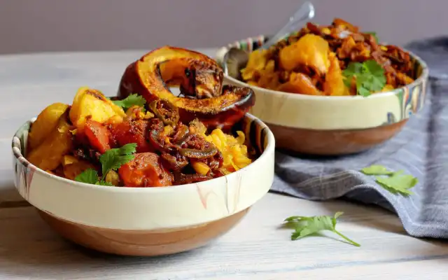 Roasted sweet potatoes, black beans, sautéed kale, cumin, and turmeric