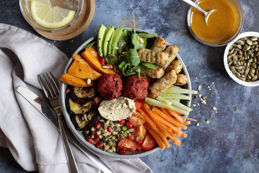 Roasted veggie grain bowl with farro, chickpeas, sweet potatoes, kale