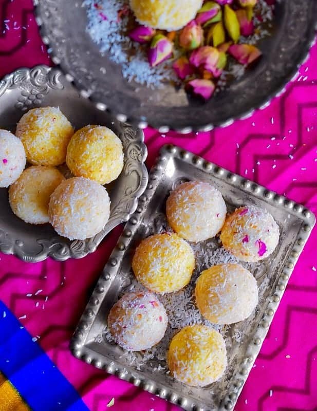 - Roll in more coconut and garnish with a saffron strand or nut.