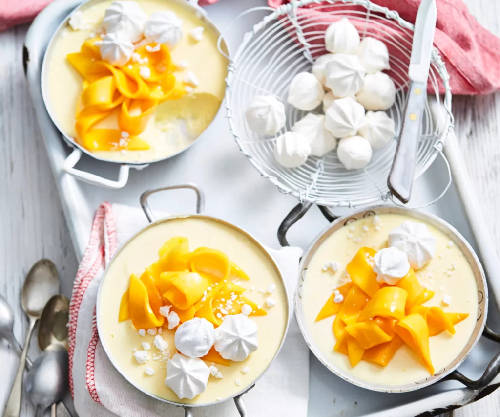 What it is: An Italian‑style cream dessert (traditionally made with cream) adapted here using coconut milk to set a delicate, silky panna cotta, paired with vibrant mango coulis.