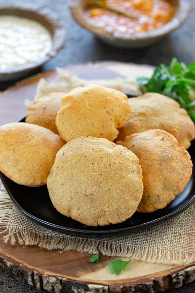 If you need to keep pooris warm before serving, use wire racks rather than closed containers so moisture escapes. Moisture makes the surface lose crispness and appear oily.