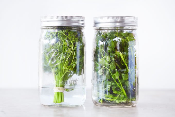 - For added freshness, place a clean layer of water at the bottom of the jar for herbs like parsley, cilantro, or basil, while leaving space for stems to stand upright.